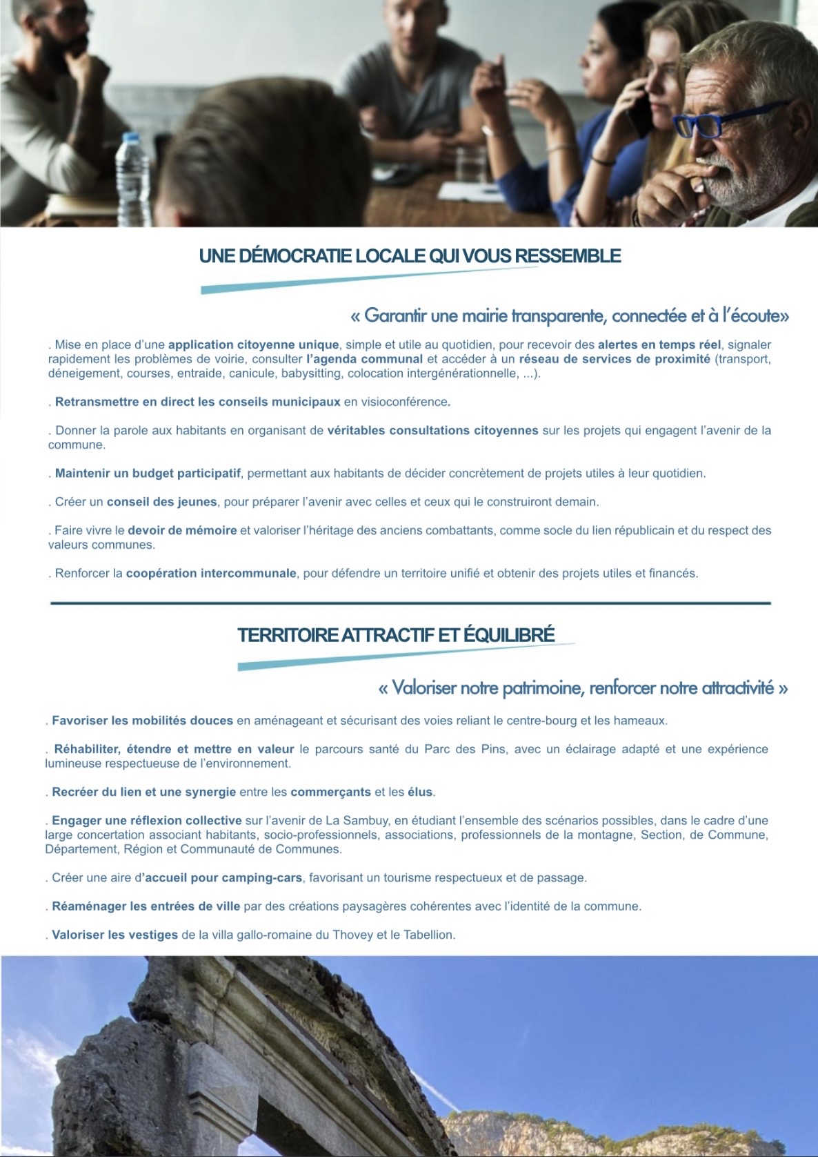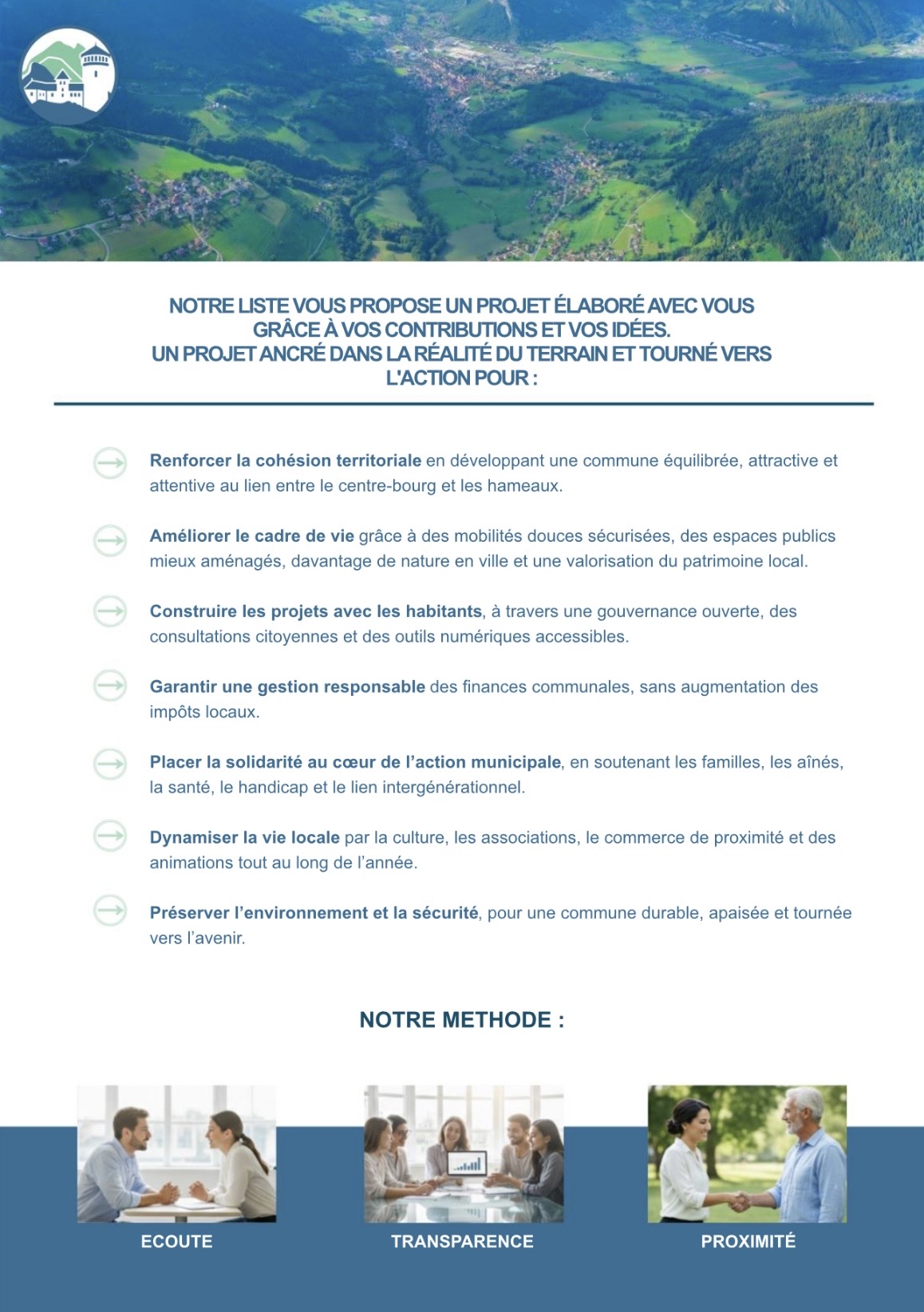 "Notre ambition : repartir sur des bases saines, solides et profondément humaines. Nous voulons raviver le dialogue citoyen, encourager la coopération et mobiliser toutes les énergies autour d’un projet commun, porteur de sens, d’ambition et en phase avec les réalités du terrain."