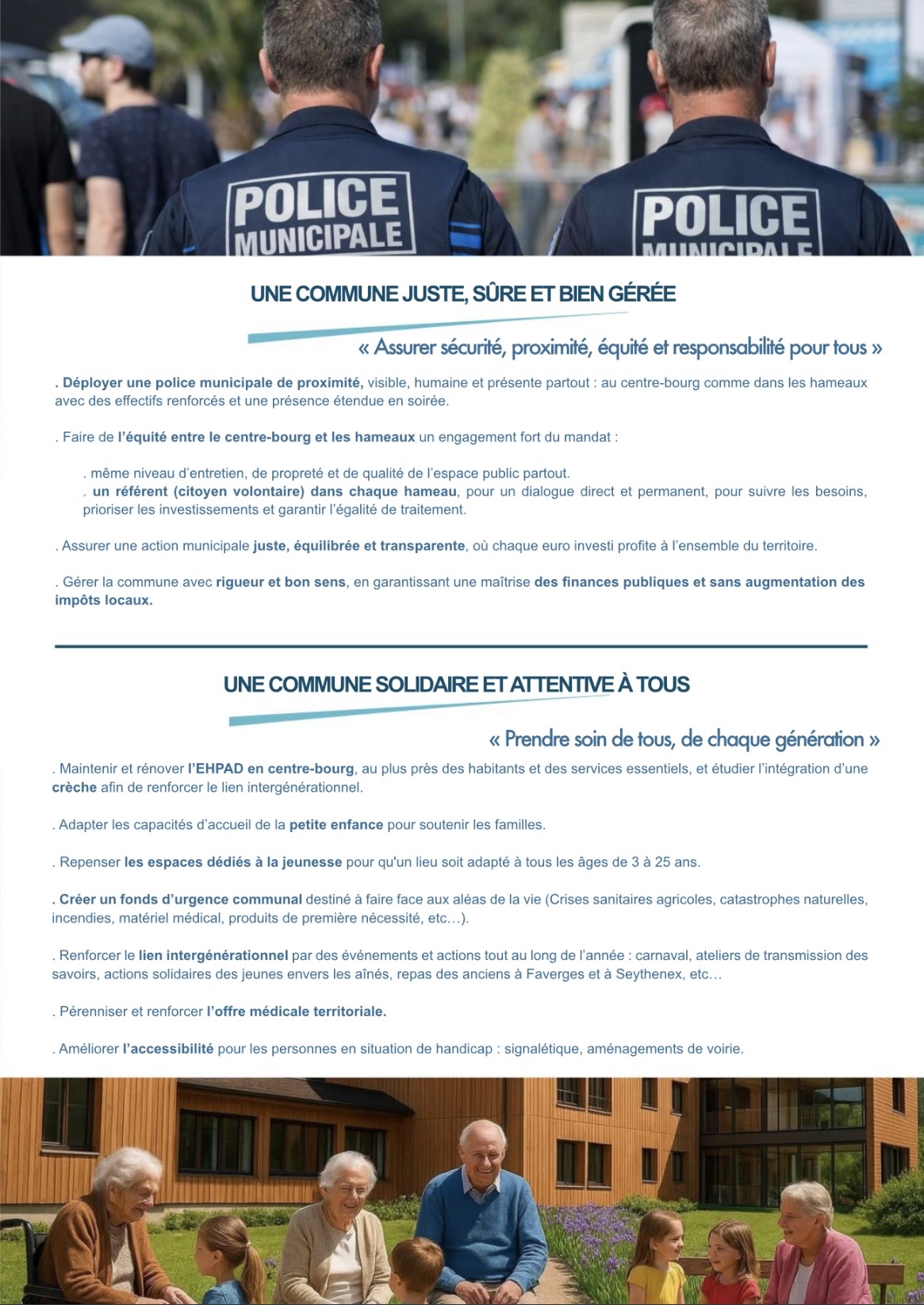 - Une ville solidaire : attentive aux besoins de chacun et respectueuse de ses aînés comme de sa jeunesse.